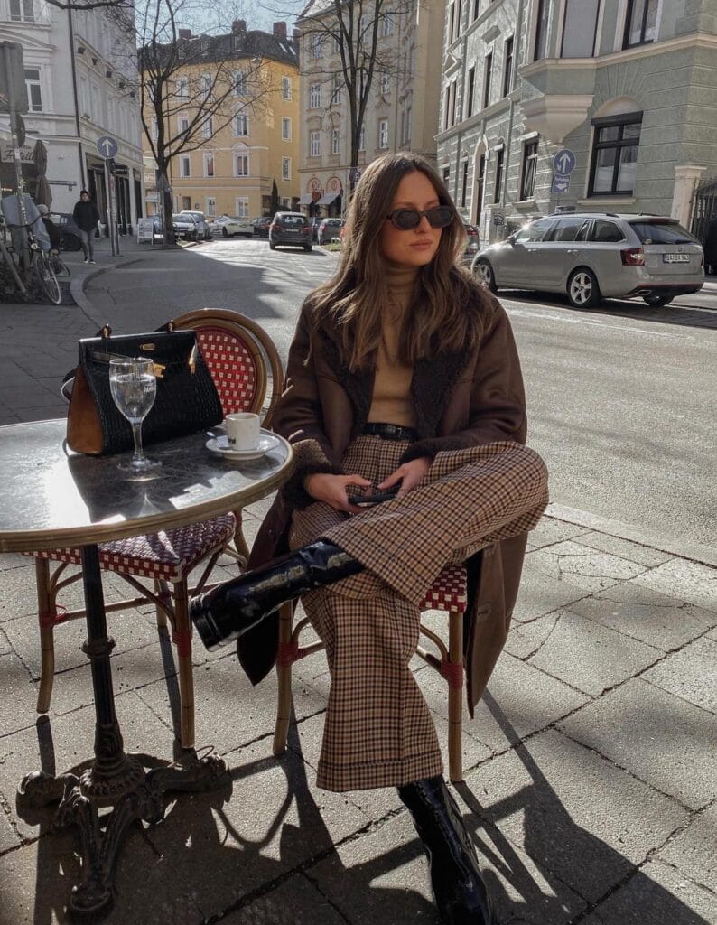 @ livia_auerThis cozy outfit is all about warmth and sophistication. The brown coat and turtleneck create a snug base, while the plaid pants bring a touch of classic style to the look.
