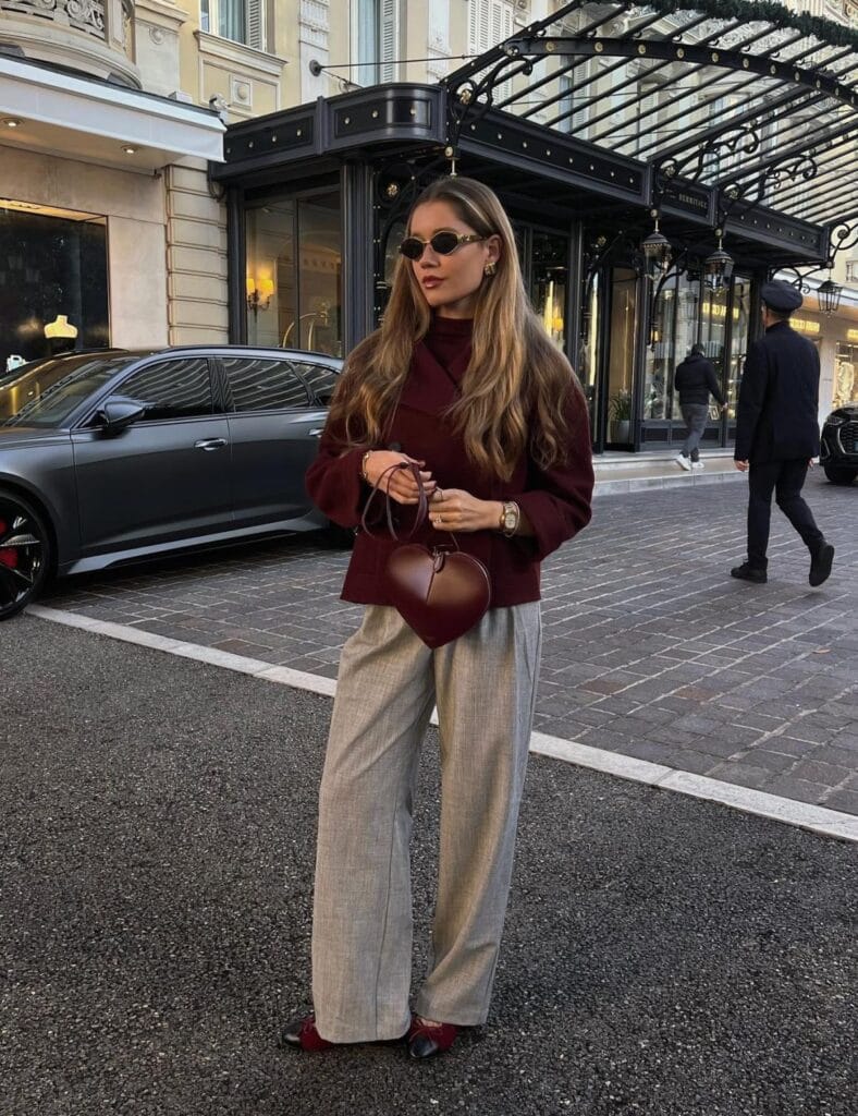 @ paola_cossentinoThe structured cream corset adds a flirty edge, while the deep maroon wide-leg pants give it a sophisticated twist. This outfit is perfect for a night out when you want to blend elegance with a hint of daring.