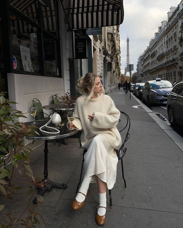 Sheās wearing a dreamy oversized cream sweater over a silky white midi skirtātotally cozy chic for winter brunches, donāt you think? Paired with cute white socks and glossy brown Mary Janes, her look is effortless Parisian elegance with a playful twist.ā
