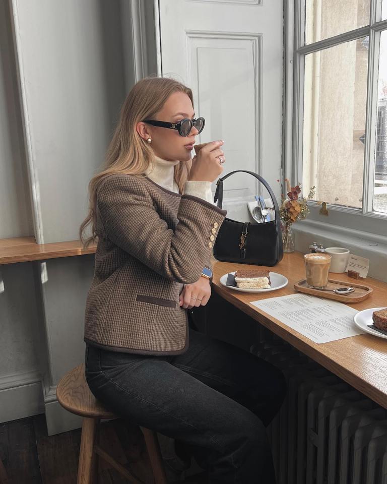 Check out this stylish vibe: a tailored brown plaid blazer sits perfectly over a cream turtleneck, balanced with sleek black jeans for an easy brunch-ready look. Chunky pearls and a little black bag take the outfit to city-sophisticate level, especially with coffee in hand.