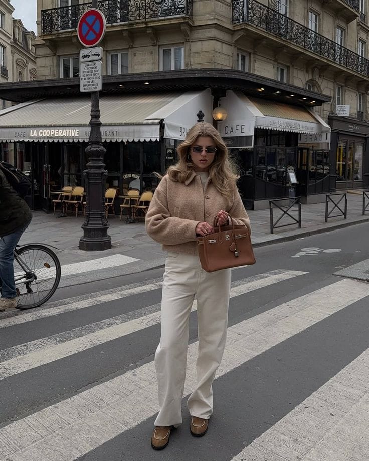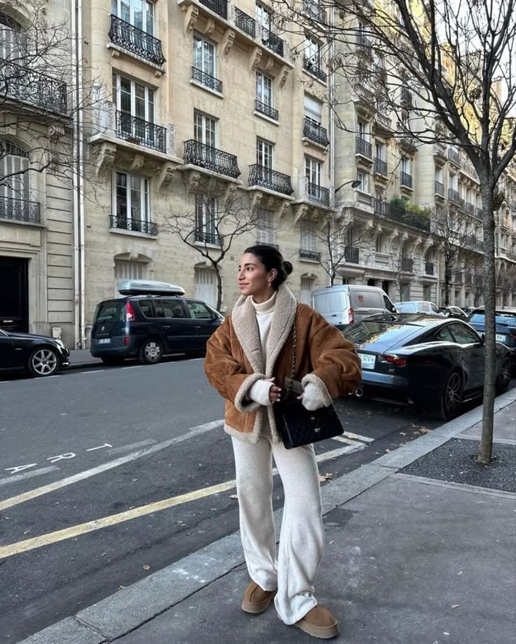 Sheās bundled up in a cozy shearling-lined brown jacket layered over a fluffy cream sweater and relaxed ivory knit pantsāso warm for a city stroll. Paired with tan slippers, the whole look is a soft, snuggly dream for chilly brunches.ā
