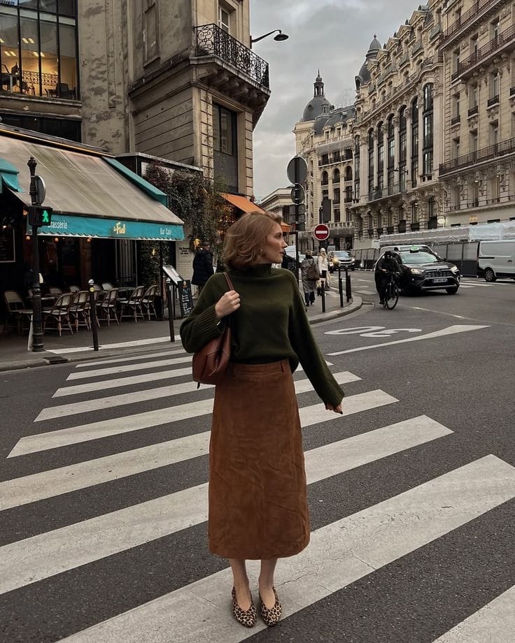 She goes for understated drama in a deep forest green sweater tucked into a rich brown suede midi skirtāpure cozy sophistication. Leopard print heels add a bit of playful spice, making this outfit a total brunch showstopper, babe.