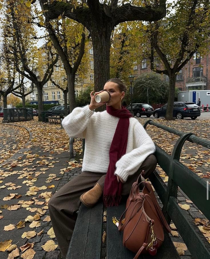 She keeps it classic in a chunky cream knit sweater paired with soft brown wide-leg pants for that ultimate fall park look. Toss in a deep maroon scarf and suede bootsāso comfy, chic, and perfect with a hot drink in hand.ā