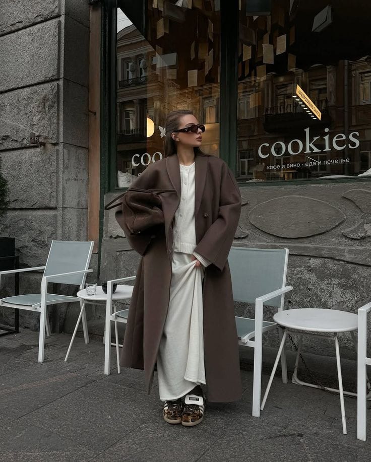 Sheās all wrapped up in an oversized deep mocha coat, layered over a creamy knit and a flowy matching maxi skirtāso lush and sophisticated. The fun pop of chunky leopard sneakers makes this winter brunch look feel totally cool and unexpected.ā