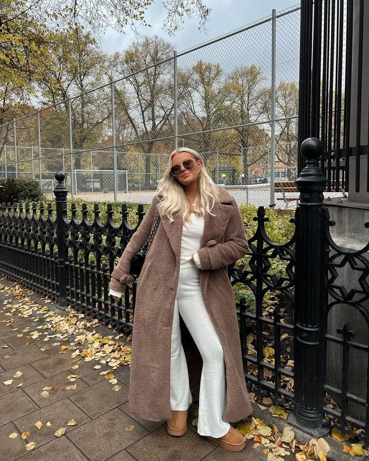 Sheās all wrapped up in a plush teddy brown coat over a soft ivory knit top and matching flared pantsāabsolute winter coziness. Those tan slippers make the look extra chill for an outdoor brunch moment.ā