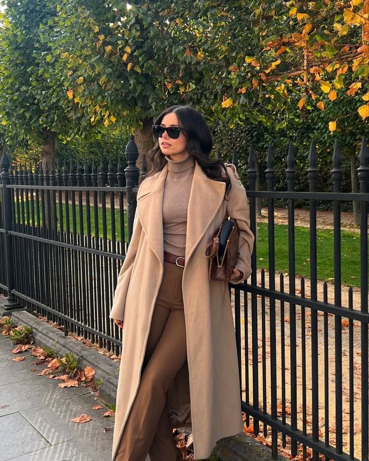 Sheās working major neutral chic with a sweeping camel coat layered over a taupe turtleneck and high-waist tan trousersāso polished for crisp fall mornings. The whole vibe is classic, comfy, and made for a stylish stroll with your latte.ā