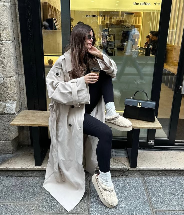 She bundles up in an oversized oatmeal trench over slim black knit leggingsātotally effortless for lounging with coffee outside. Chunky cream slippers and cozy socks round out this simple-meets-stylish vibe, perfect for chilly mornings.ā
