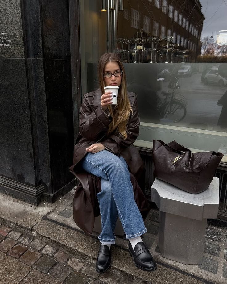 Sheās looking ultra-cool in a dark chocolatey leather coat layered over a simple top, paired with classic blue straight-leg jeansālove how easy this is for a winter brunch. Black socks and chunky loafers add a city edge to her cozy cafĆ© style.ā