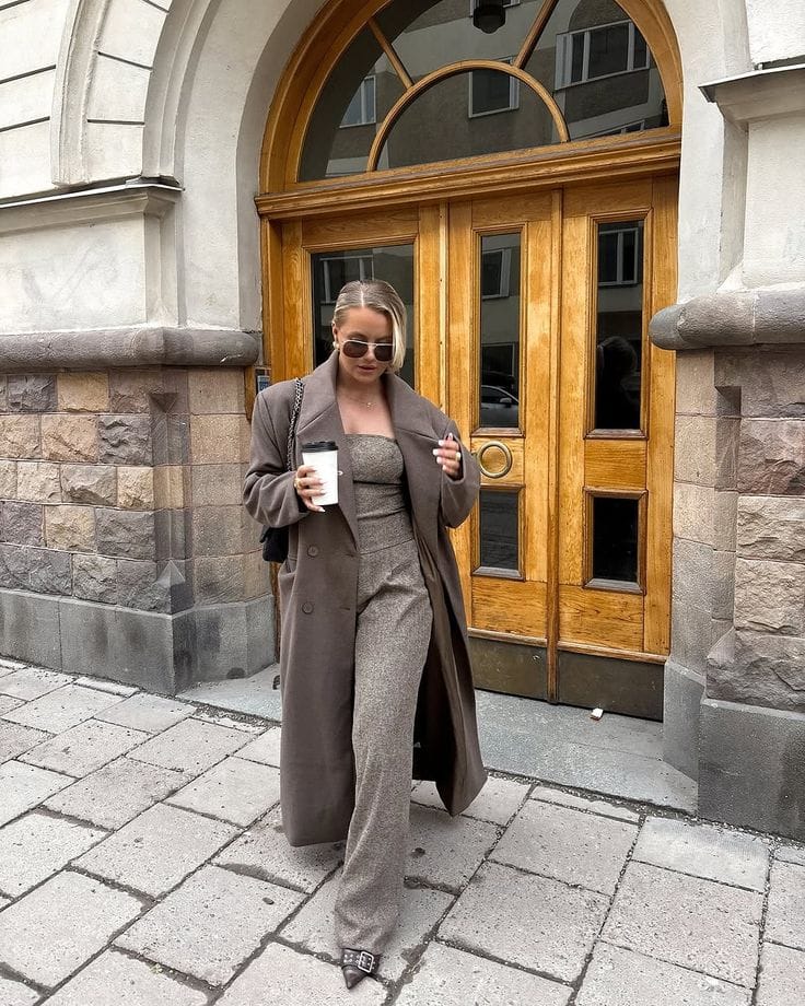 Sheās serving monochrome glamour in a fitted taupe knit top and matching trousers, topped off with a slouchy taupe overcoatāso coordinated and chic. The look is finished with sleek pointed brown heels, making it absolute city brunch perfection.ā