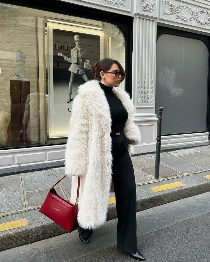 Sheās giving serious glam in a dramatic ivory faux fur coat over a fitted black turtleneck and high-waist black trousers. Pointy black boots keep it classy, making this the ultimate statement winter brunch moment.