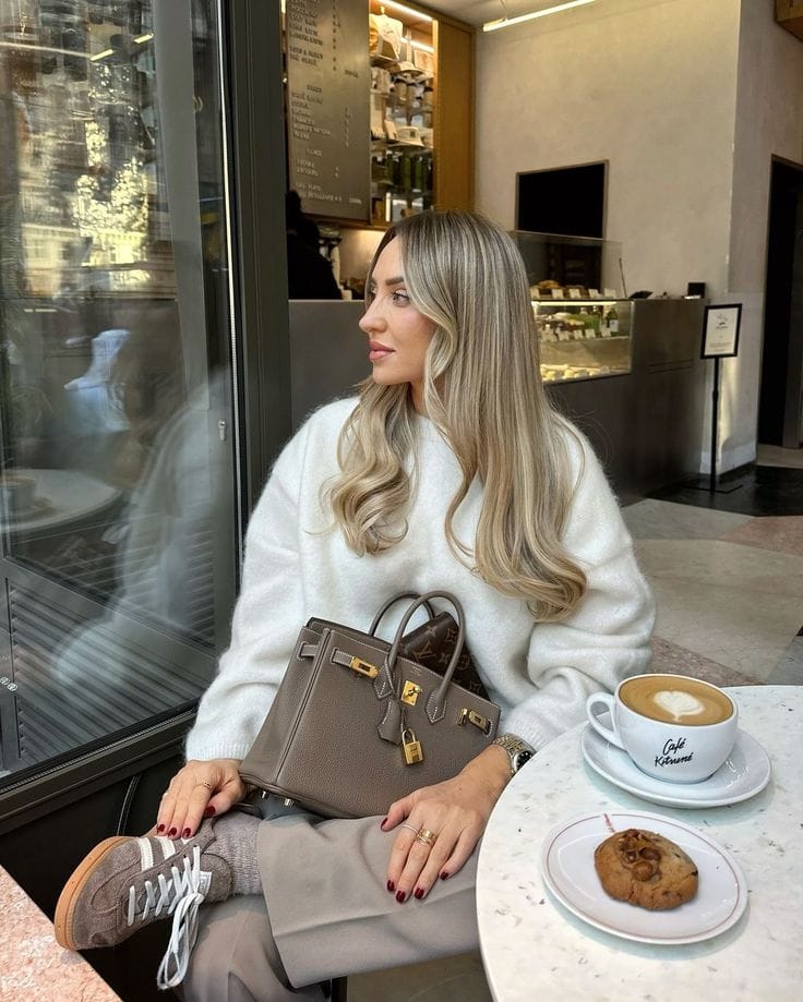 Sheās looking luxe in a fuzzy white cashmere sweater paired with taupe wide-leg trousersāso comfy but totally elevated for brunch. Suede sneakers and cozy wool socks make this look perfect for sipping lattes at a chic cafĆ©.ā