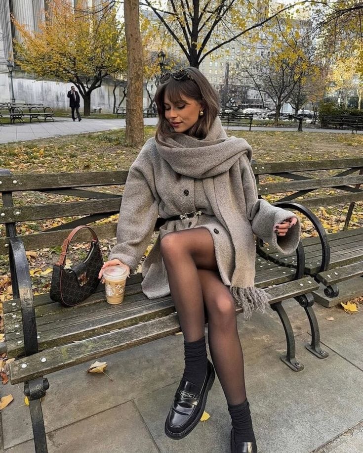 Sheās keeping warm in a plush grey wool wrap coat with a chunky matching scarf, styled over a short belted mini skirt for that chic city park vibe. Black loafers, sheer tights, and cozy socks take it to sophisticated brunch perfection.ā