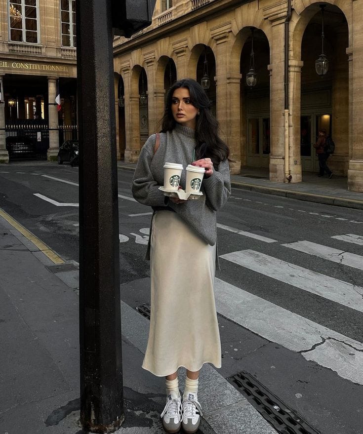 She keeps it sweet and simple with a chunky slouchy grey knit tucked into a buttery satin midi skirt, for a brunch look that feels both comfy and elevated. Sneakers and little socks make this outfit cafƩ-casual perfection for running around town.