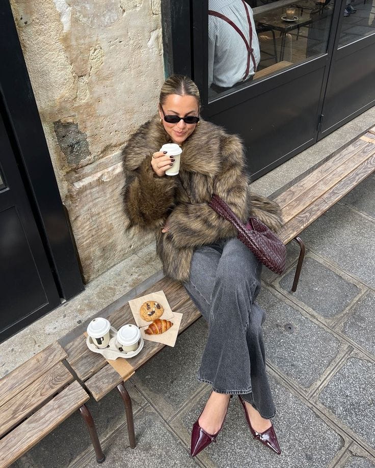 Sheās keeping it extra cozy in a plush brown faux fur coat over vintage-wash flared jeansāseriously, this is comfy cool-girl energy for a winter cafĆ© run. Add those pointy burgundy heels and a woven tote, and sheās totally brunch-ready with Parisian flair.