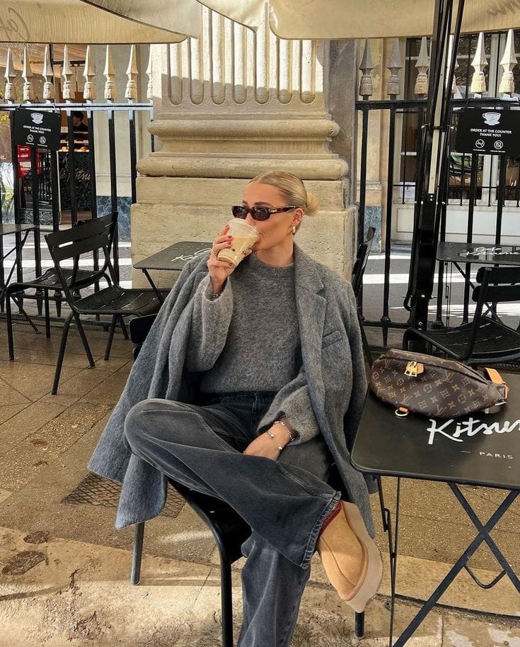 She bundles up in a soft grey wool coat layered over a chunky grey sweater and classic washed black jeansāseriously the ultimate comfy chic combo for brunching. Those tan suede slippers just add an extra cozy touch to her laid-back cafĆ© style.ā