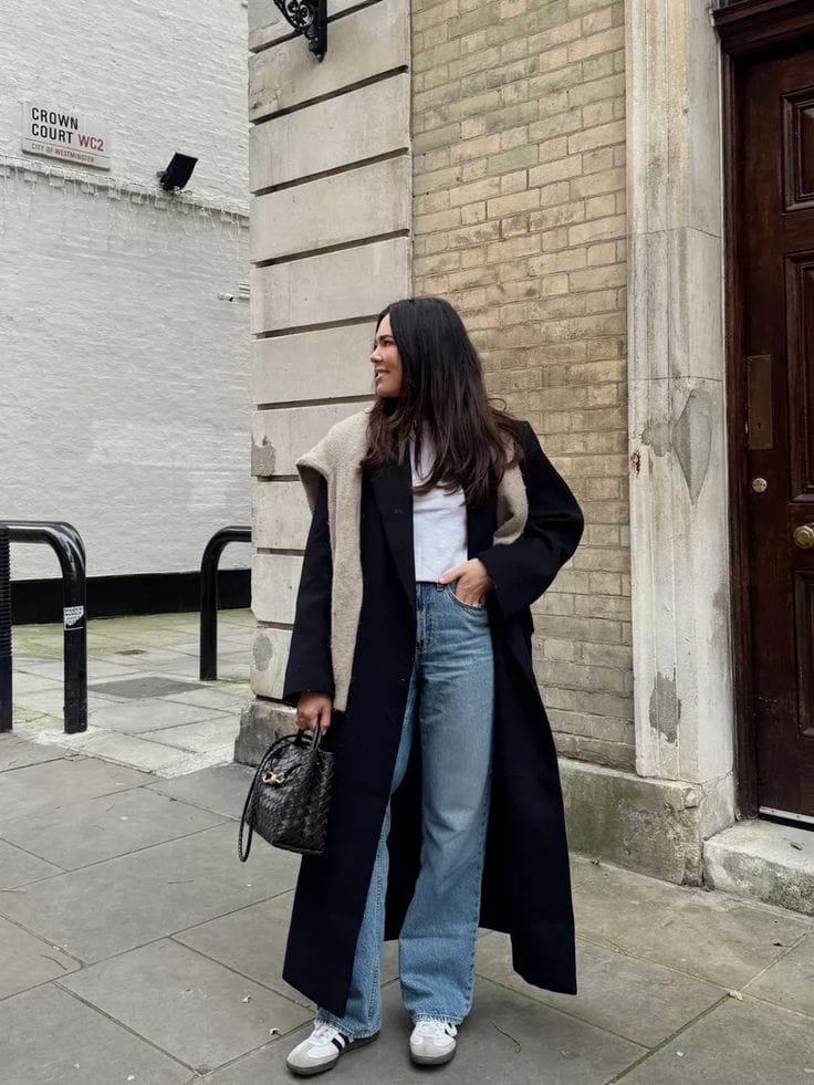 Sheās rocking a dramatic long black coat over a white tee and relaxed light blue jeansāeffortlessly cool with major off-duty vibes. The shearling scarf and worn-in sneakers make it the perfect outfit for a weekend coffee stroll with friends.ā