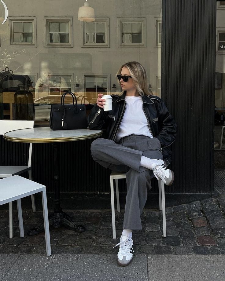 She nails casual-cool with a sleek black leather jacket thrown over a crisp white tee and charcoal tailored trousersāsporty white sneakers keep it all super relaxed. The whole look feels modern, easy, and perfect for a comfy coffee date out.ā