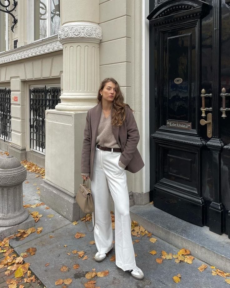 Sheās got that autumn glow in a soft taupe blazer paired with a cozy v-neck knit and flowy cream wide-leg trousersātotally classic and elevated for chilly mornings. Add in the matching sneakers and itās an everyday-chic brunch outfit youāll want to copy.ā