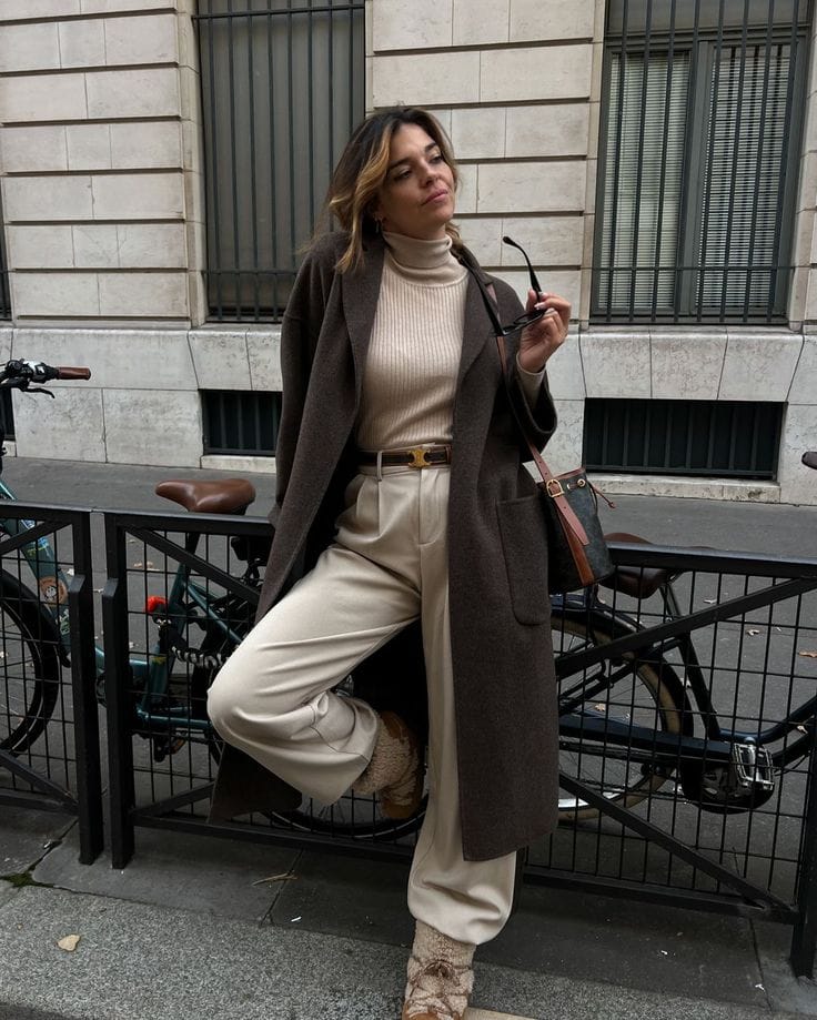 9. Elegant Chocolate Coat & Creamy Turtleneck Pants Set