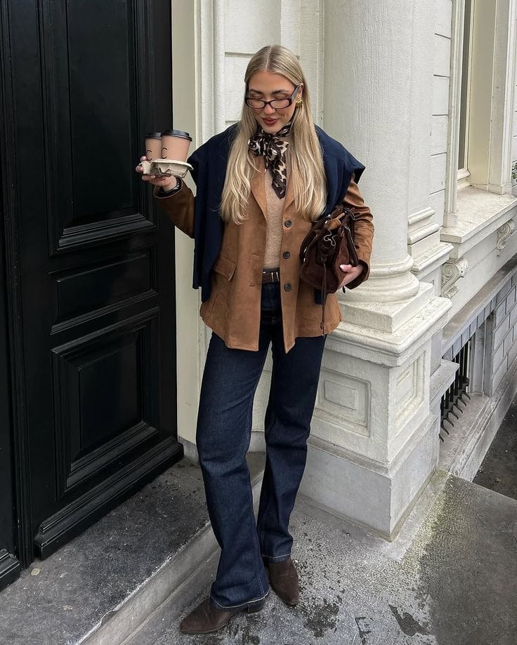 Sheās rocking a warm tan suede blazer over a neutral sweater, paired perfectly with dark straight-leg jeansāsuch a classic and put-together winter brunch combo. The navy sweater tossed over her shoulders and pointed suede boots make it look even more elevated and cozy.