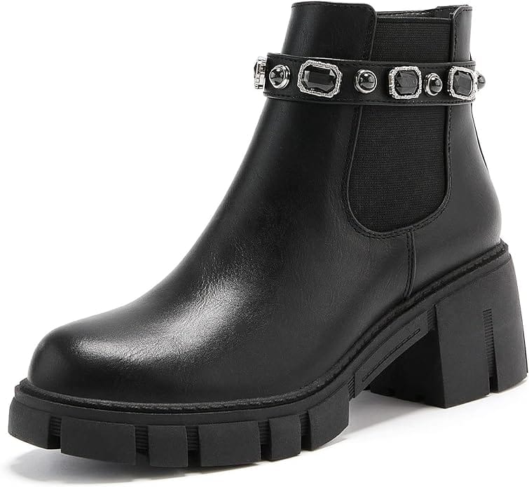 Embrace cozy elegance with this ensemble, featuring a chic sweater dress paired with tights, trendy chunky ankle boots, and a sleek black handbag.