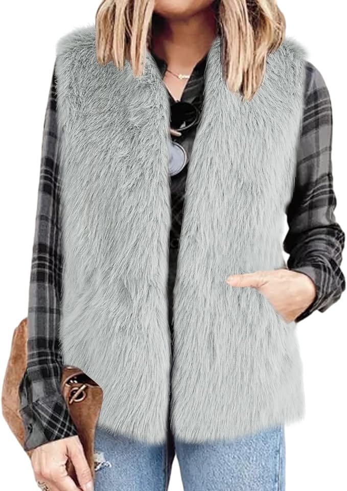 This ensemble brings together elegance and edge, featuring a chic gray faux fur sleeveless waistcoat paired with a classic black turtleneck sweater, sleek leather pants, and stylish leather Chelsea booties.