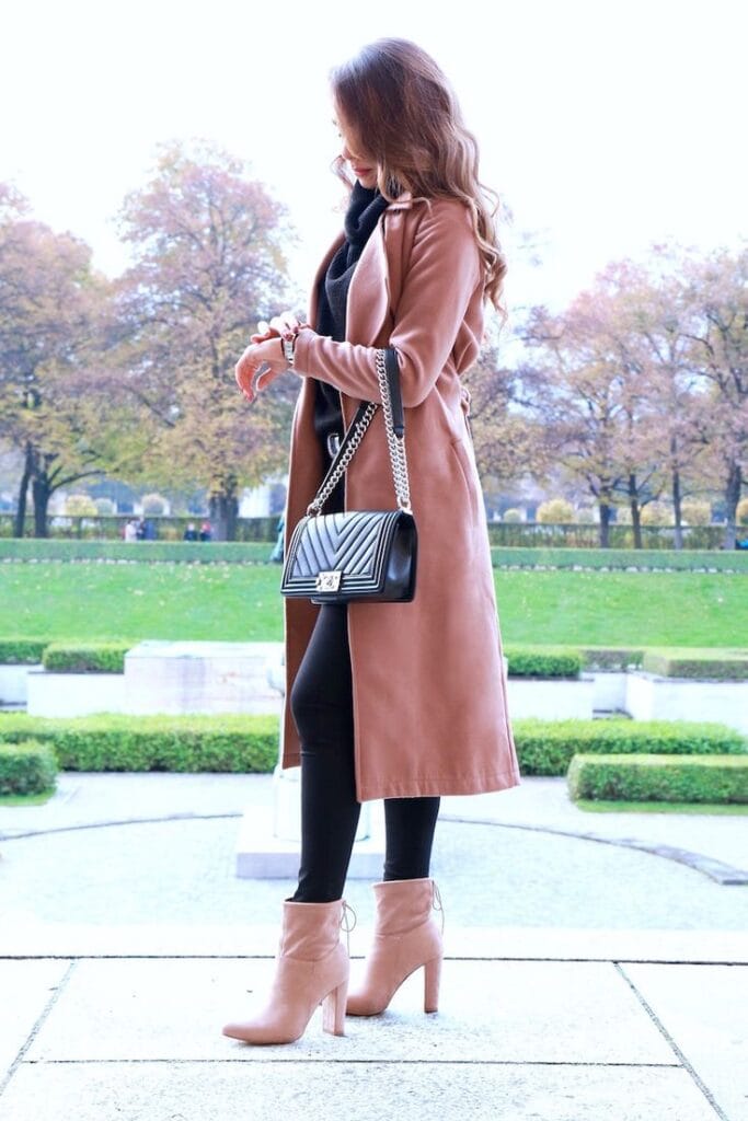 20. Black Turtleneck, Leggings, Pink Overcoat Ensemble
