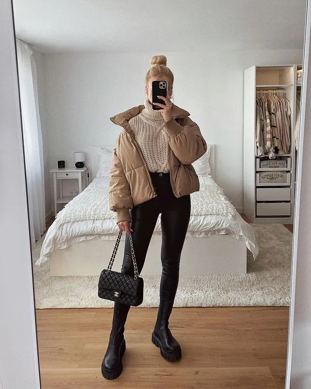 35. Beige Puffer Jacket, Sweater, and Black Pants Ensemble