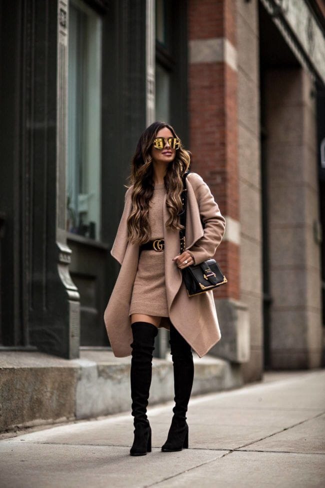 Elevate your style effortlessly with a belted sweater dress paired with chic boots and a coordinating jacket.