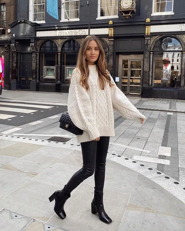Embrace a blend of comfort and style with an oversized sweater paired with sleek leather pants and stylish boots.