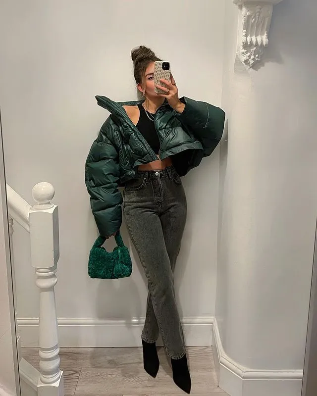 Combine urban edge with sophisticated flair by pairing a cropped puffer jacket with stylish heeled boots.