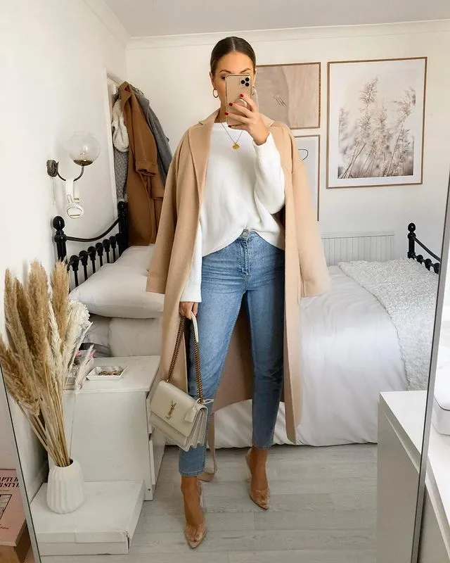 Elevate casual charm with a classic ensemble of a sweater and jeans, paired effortlessly with stylish heels and an overcoat.