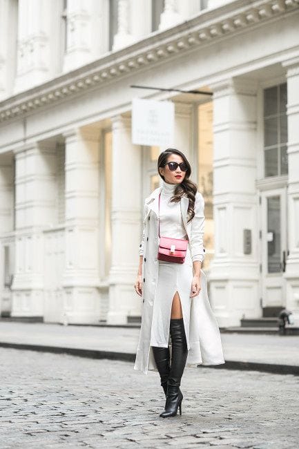 14. White Sweater Dress, Maxi Overcoat, Thigh-High Boots, Red Tote Ensemble