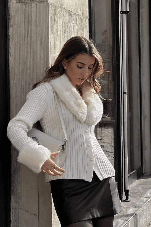 Embrace style contrasts with a cozy fur neck cardigan paired with a sleek mini leather skirt.