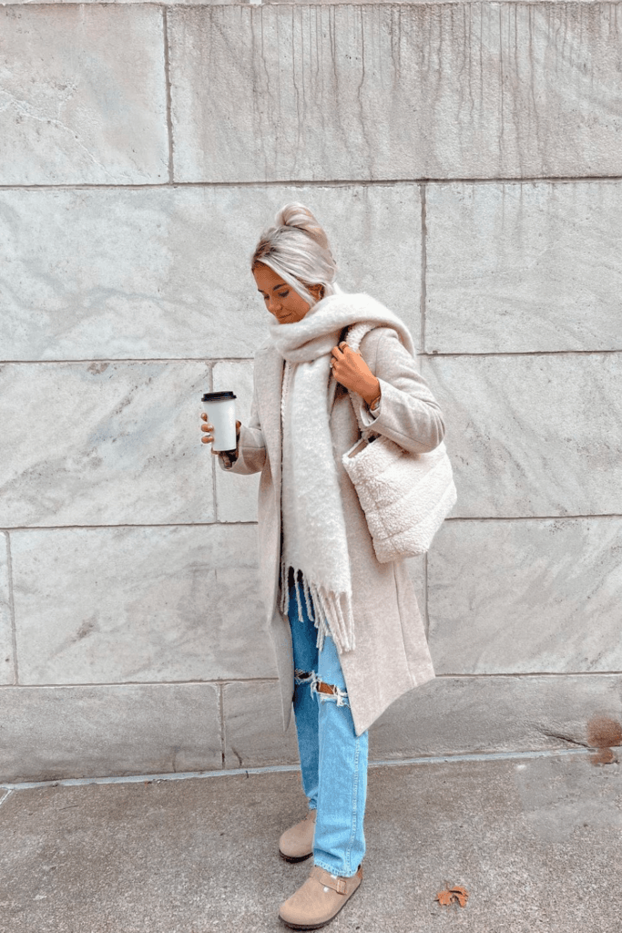 Effortlessly blend sophistication and comfort by pairing a stylish blazer with classic jeans, cozy Uggs, and a snug scarf.
