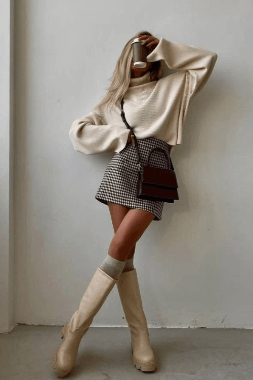 This ensemble merges comfort with trendy style, featuring an oversized turtleneck sweater paired with a high-waist bodycon mini skirt.