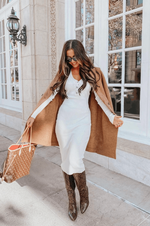 15. Sweater Dress, Long White Coat, Tote, Black Heels Ensemble