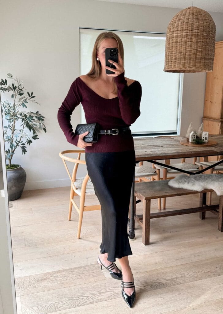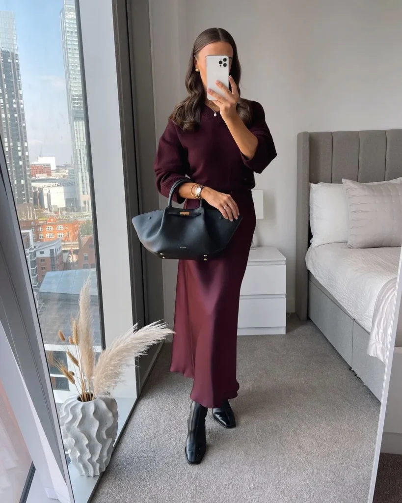 @ whatemworeA rich burgundy top paired with a satin burgundy skirt is an elegant and luxurious combination. Black boots and a black handbag create the perfect balance of chic and practical, making this an ideal winter night outfit. Pair it with a bold red lip to complete the look.