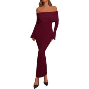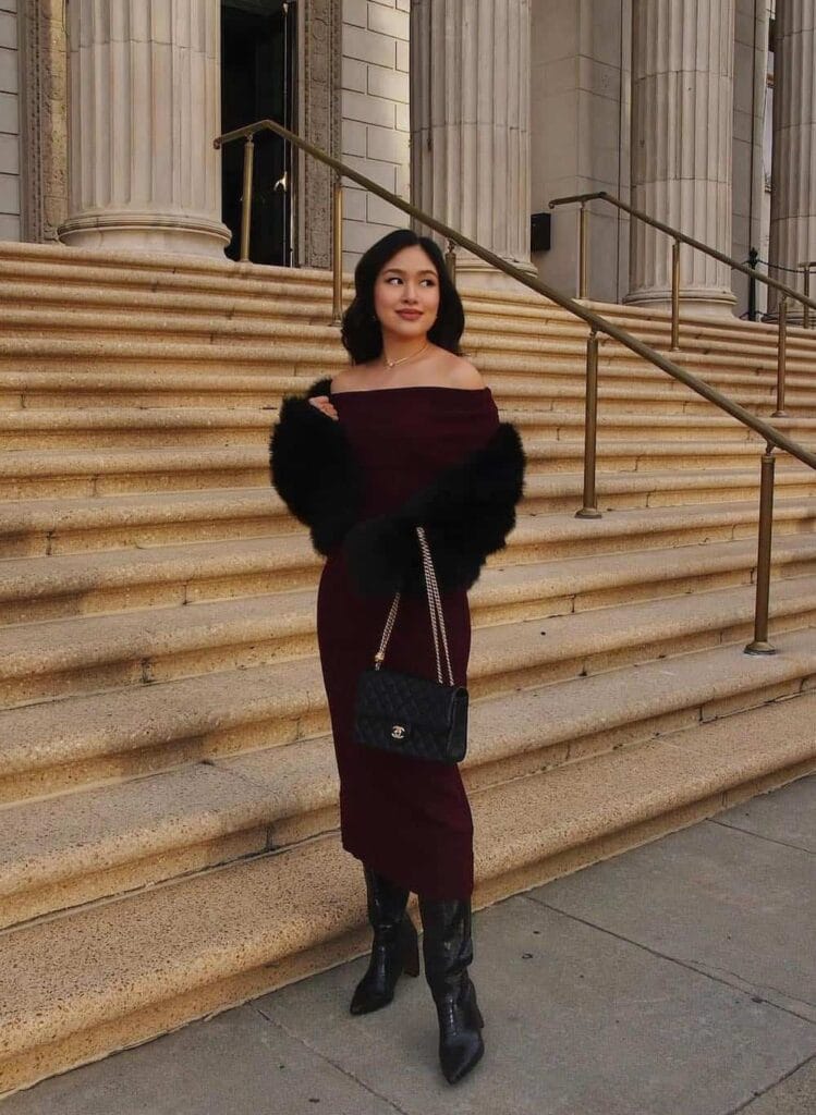 An off-shoulder maxi dress is the epitome of winter chic. Add some sparkle with statement earrings and pair it with heeled ankle boots for a warm yet sultry vibe. Throw on a long coat, and you’re ready to conquer a chilly evening in style.