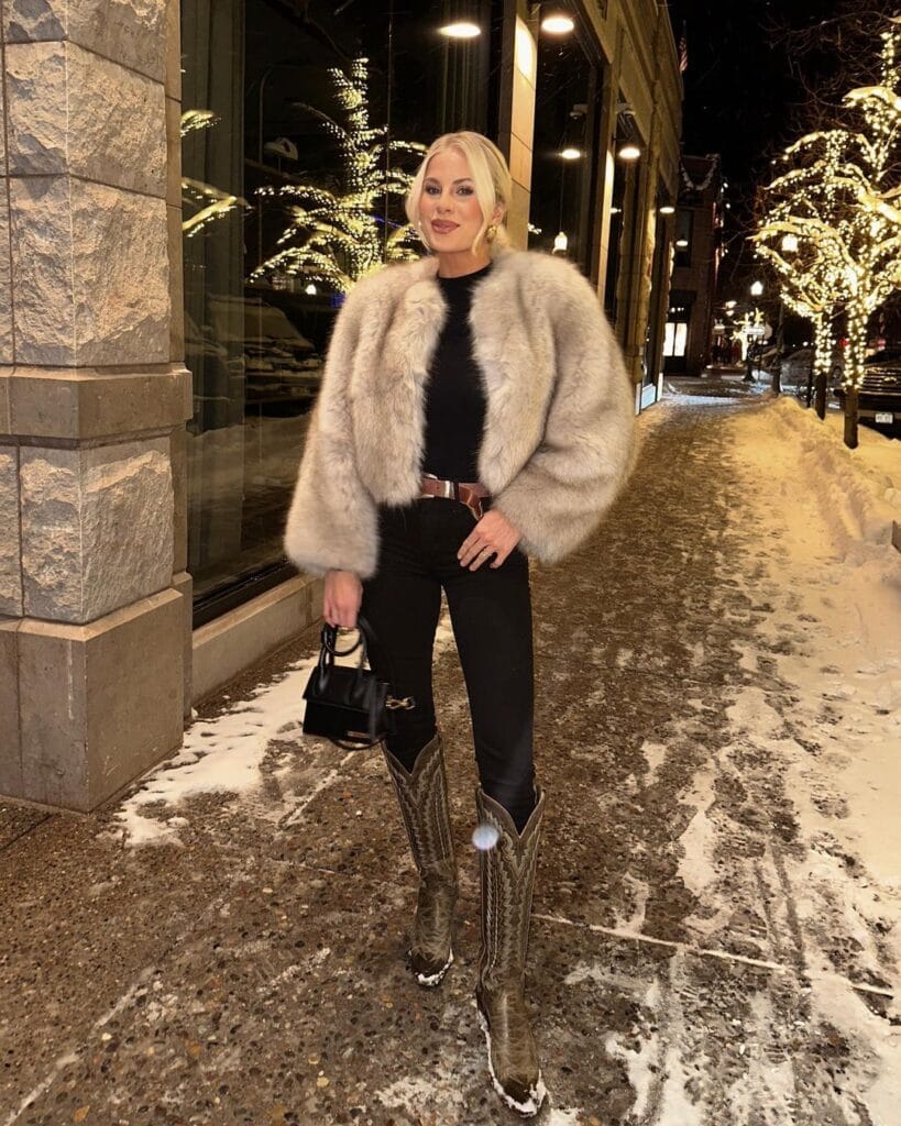 3. Fur Jacket with Black Outfit and Cowboy Boots