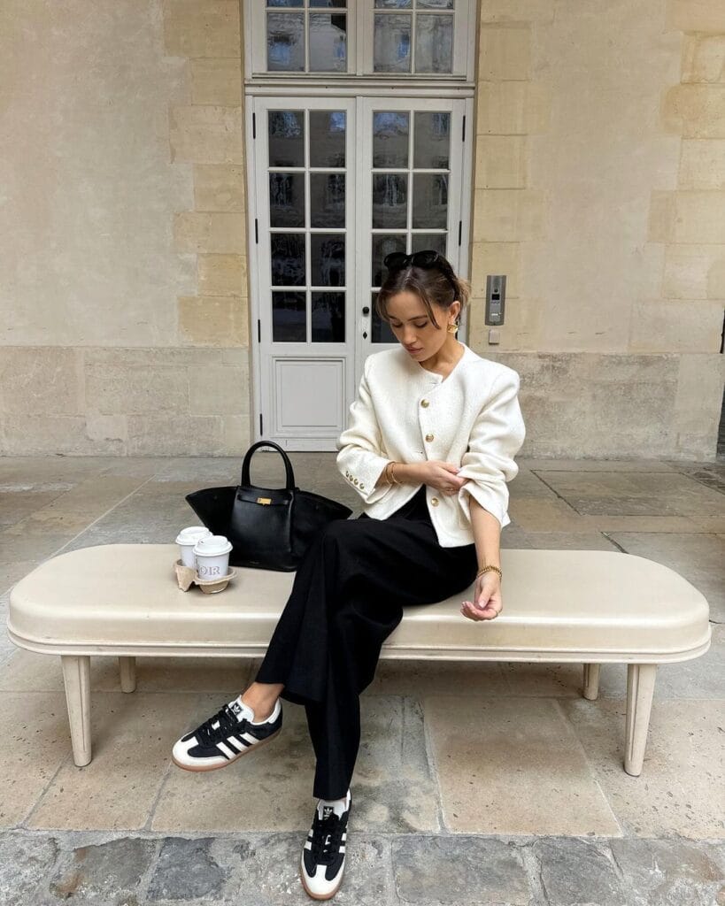 @ kateehutchinsStay effortlessly polished with a white tweed blazer paired with black tailored pants and clean sneakers. This chic yet casual outfit is great for daytime outings or coffee catch-ups. Add a crossbody bag to tie the look together.