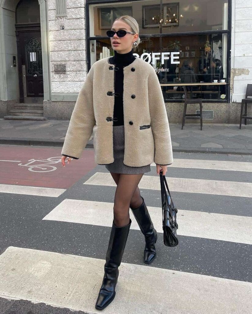 17. Cozy Coat with Mini Skirt, Turtleneck, and Boots
