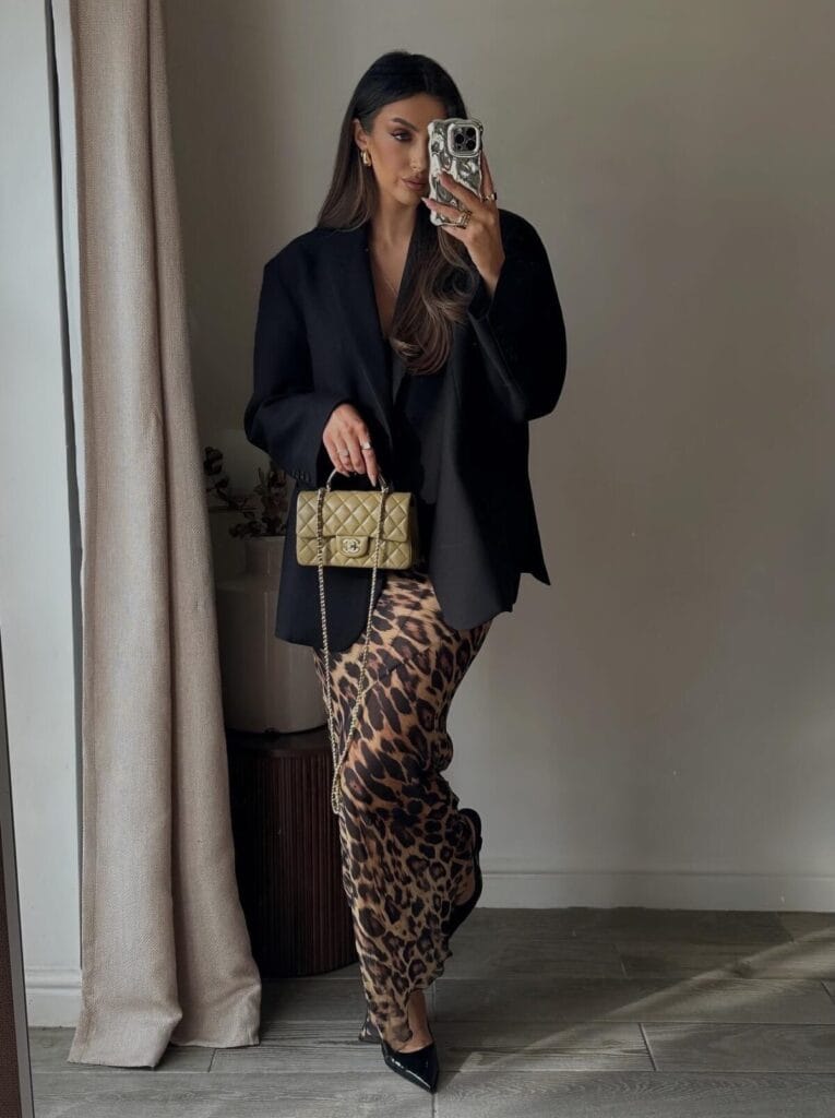 @ olivialaura_Flaunt your fierce side with a leopard-print skirt and an oversized black blazer. A fitted black top and glossy high heels pull the look together, making it a power outfit with undeniable sass. Add a structured handbag to complete the boss-lady vibe.