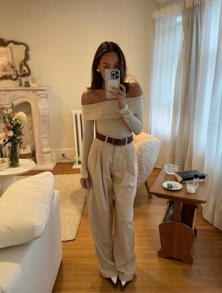 @ emmalegerChannel neutral tones with light beige high-waisted, wide-leg pants paired with a beige off-the-shoulder long-sleeve top. This monochromatic look is effortlessly chic and perfect for cozy brunches or casual dinner dates. Add dainty gold jewelry and nude heels for a refined finish.