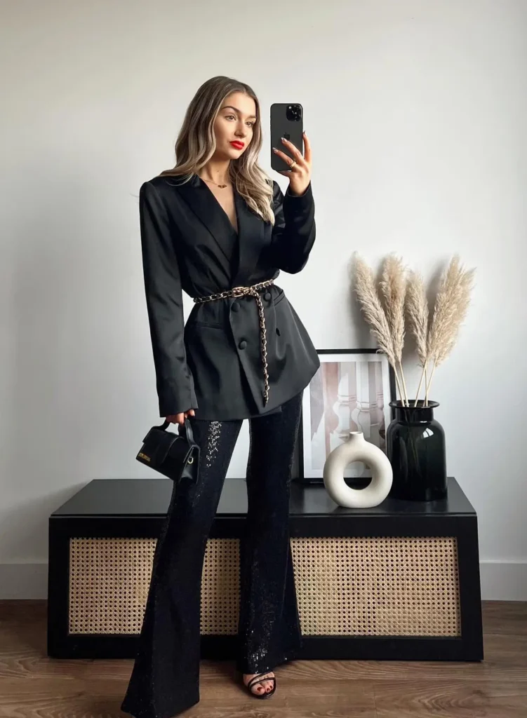 @ lilyisabellaclarkFor a sleek and sophisticated look, a black silk blazer cinched at the waist with a gold chain belt is paired with chic black sequin pants. This combo oozes glamour and is perfect for upscale events or a night out on the town. Add metallic heels to enhance the luxe factor.
