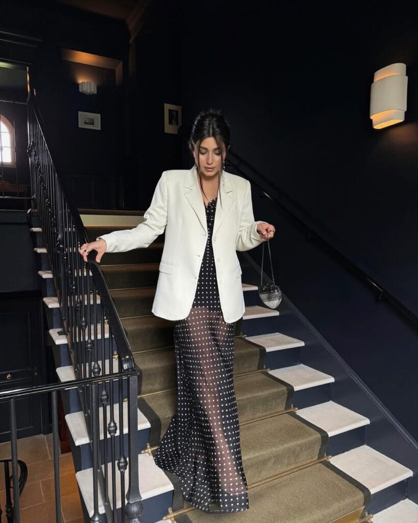 10. Modern White Blazer with Sheer Polka Dot Maxi Dress