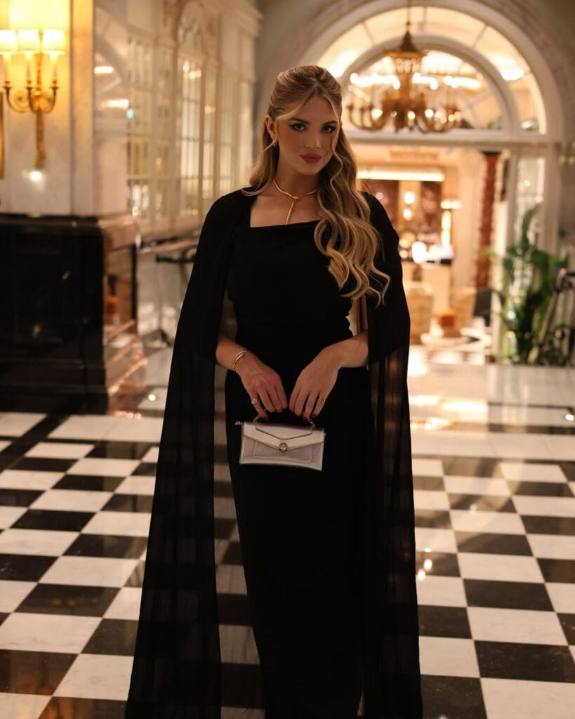 @ ultrasophisticateSheās radiating classic glamour in a sleek black gown with bold sheer cape sleeves, bringing major drama and elegance. That flowy, floor-length cape makes the whole look feel extra luxuriousāseriously a showstopper for any winter formal!