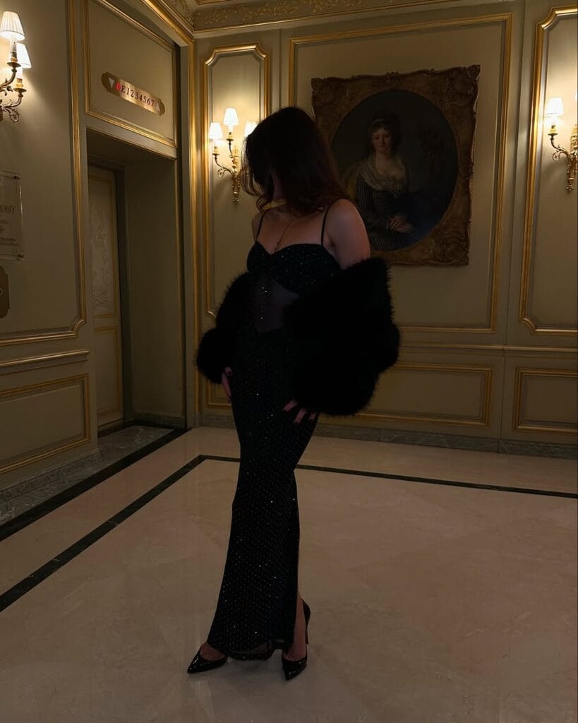 @ lucygrasssoSheās looking luxe in a fitted, sparkling black gown with dainty straps and sheer paneling, draped in a plush black faux fur wrap. The look is seriously glamorousāthink bold, star-studded winter party vibes!