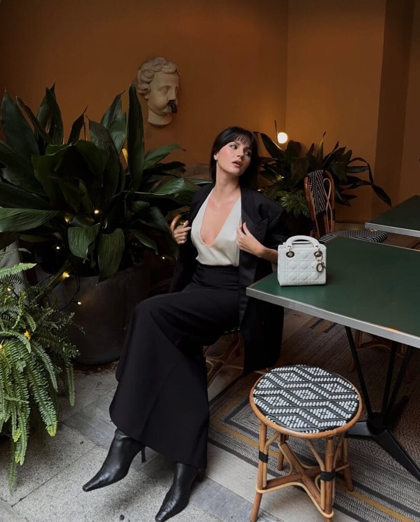@ lucygrasssoSheās totally nailing the power suit trend with black tailored pants and a matching oversized blazer, layered over a delicate lace bralette. This mix brings the ultimate balance of sharp, modern suiting and playful, flirty vibesāperfect for winter nights out!