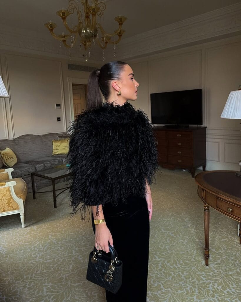 @ anna.weinSheās serving pure luxury in a dramatic black feathered top paired with a sleek velvet black maxi skirt. This look is so extra and elegantāperfect for making a glamorous entrance at any winter party!